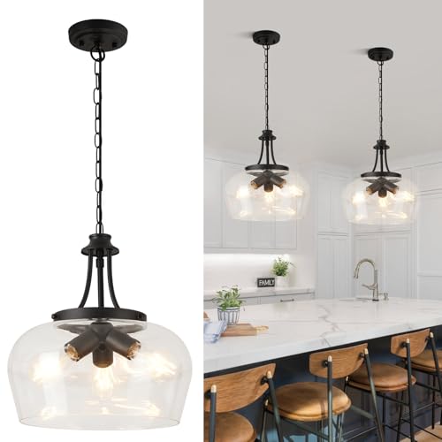 ?Dining Room Chandelier Design Inspiration?This rustic farmhouse style pendant lights kitchen island features a modern design that interprets classic urban industrial style and adds a vintage vibe to your space. It features a black finish with a prominent round clear seeded glass shade that adds a vintage look and feel. Perfect for your dining room, kitchen island, living room, bedroom, foyer, staircase, Office, hallway, entryway.