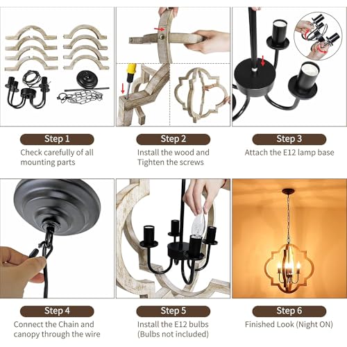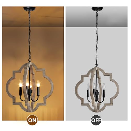 ?Wooden Chandeliers?This 4-light chandelier is made of high-quality solid wood and black metal. The simple shaped curve outline and vintage wood grain finish give this artistic chandelier a rustic yet modern farmhouse style, it will create a warm atmosphere for your home, bringing you an elegant yet vintage feel.