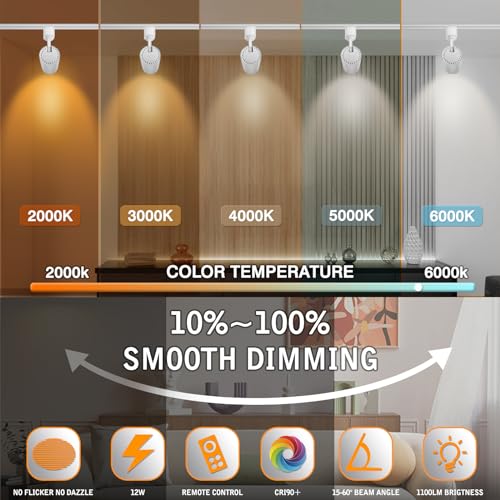 ?????Stepless Diming from 10%~100% by Remote Control?The remote control track lighting heads are smoothly dimmable from 10%~100% through the included remote controller, reducing the cost and also the difficulty to buy and match with the dimmer during installation. And never worry the missing of remote controller, each 12-Pack track light heads equiped with 2pcs remotes with memory function, can memorize the last setting before being turned off. Meanwhile you could also devide your lights into two group by 2 remotes according to our instruction.