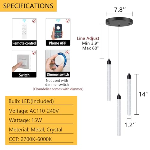 Crystal chandelier come with 15W LED dimmable light source (dimmer included), can be used in volt AC110V/120V/220V/240V directly, remote control the lighting color and brightness changed