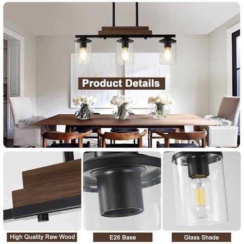 Natural Wood & Metal Design: This 3-light wood farmhouse chandelier for dining room combines solid natural wood and matte black metal. The minimalist structure with clear glass shades delivers a rustic-industrial look, perfect over dining tables or kitchen islands