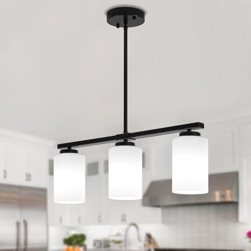 ????MODERN AND ELEGANTE CHANDELIER - This island lights for kitchen is made of high-quality metal and durable glass shade. With a sturdy metal frame, anti-rust and no need to worry about getting oxidation. This elegant linear chandelier perfects for dining room or kitchen island, it can be diffuse the light softly, add an exquisite luxury and modern aesthetic to your home