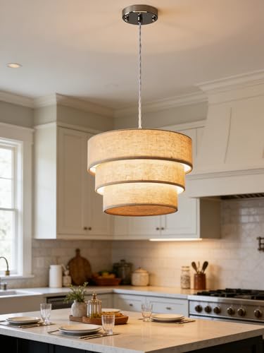 ?CREATIVE 3-TIER DESIGN? This compact hanging light fixture (Diameter: 13.4", Height: 7") boasts a unique,3-tier drum lampshade crafted from beige linen fabric —effortlessly keeping your home decor on-trend while complementing the aesthetic of nearly any space. Seamlessly blending modern and vintage styles, it exudes timeless elegance and charm
