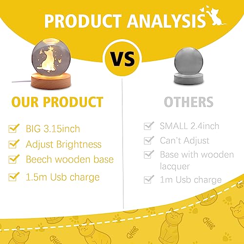 ???? Exquisite Cat Crystal Ball Lamp?3D cat crystal ball measures 3.15x3.15 inches, equipped with a wooden base, the crystal ball can be stably placed on the wooden base. Besides, 1 x1.5 miter USB color changing control cable also packs in a gift box. With sturdy packaging, you will receive an attractive gift intact. It will be a perfect birthday gifts Christmas gifts for cat lover and women.