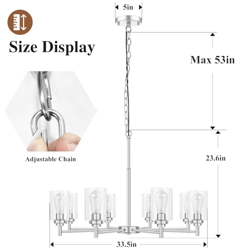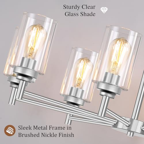 Modern Farmhouse Chandelier: The 8-light chandelier is a piece of art which presents itself in an elegant look with sleek brushed nickel frame and clear cylinder glass shades. Definitely an eye-catching finish for your home decor