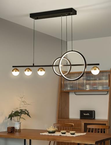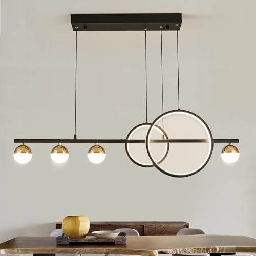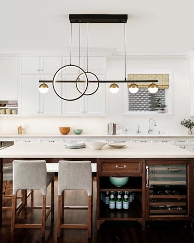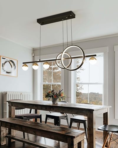 [Stylish Design & Durability] Elevate your interior with this modern linear LED chandelier, showcasing a striking design featuring 2 circular pendant lights and 4 globe lights. Crafted from high-quality silicone and aluminum, it merges contemporary aesthetics with exceptional durability, making it a perfect fit for dining rooms, kitchen islands, and entryways while remaining a focal point in any setting.
