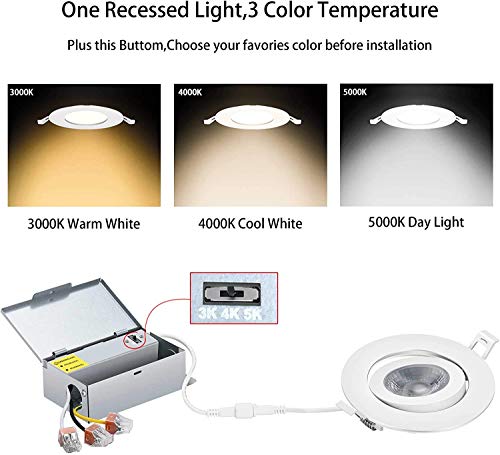 CCT Control by DIP Switch and Adjustable Lights - Ultra-thin design without housing needed, with 180-degree rotation and 38-degree beam angle, the eyeball recessed light can be adjustable for any place that you want. Warm White/Day White/Cool White in one light fixture, you can pick a color and set it by DIP Switch on the junction box before installation. Press “1” on 3000K, Press “2” on 5000K, Press “3” on 4000K.