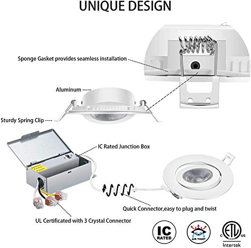 IC Rated with Junction Box - The package comes with IC Rated J-Box with a crystal connector, an airtight type IC with two springs, which is permitted to be in contact with insulation in ceilings, which means the junction box is thermally protected. The aluminum light makes it durable and can be used in dump locations.