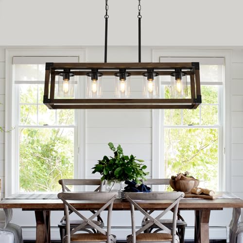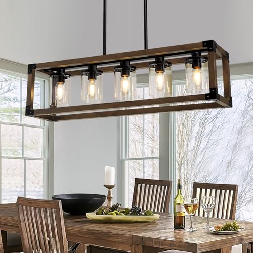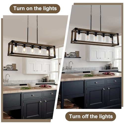 ?????Modern Farmhouse Style Pendant Light Fixture?5-light pendant lighting for kitchen island with wood and black metal finish suit for modern and Industrial style. Hanging kitchen lighting fixtures with Clear Glass Lampshade create a relaxing atmosphere that. adds vibrant vibe to any room, especially kitchen island, dining room, kitchen, dining table, living room, restaurant, and more.