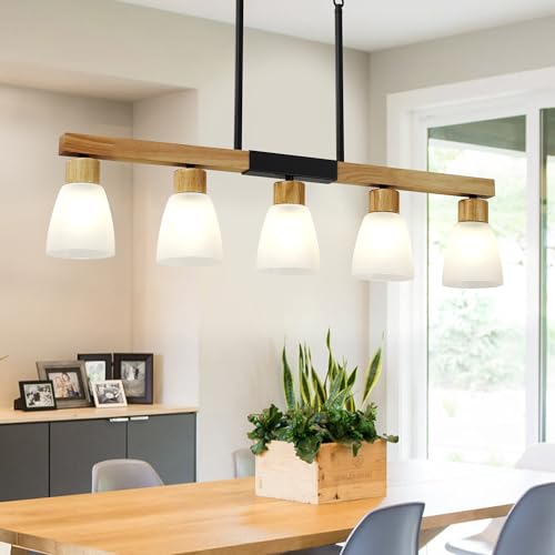?????Beautiful style?: This simple style pendant lights kitchen island is specially designed for kitchen islands and dining tables. The perfect combination of solid wood, matte black metal and frosted glass lampshade shows the beauty of simplicity and refinement. It is stable yet elegant. It can easily adapt to modern minimalist and rural farmhouse style decorations. Under the illumination of milky white glass, the five light sources become soft, bright and comfortable, creating a warm dining atmosphere.