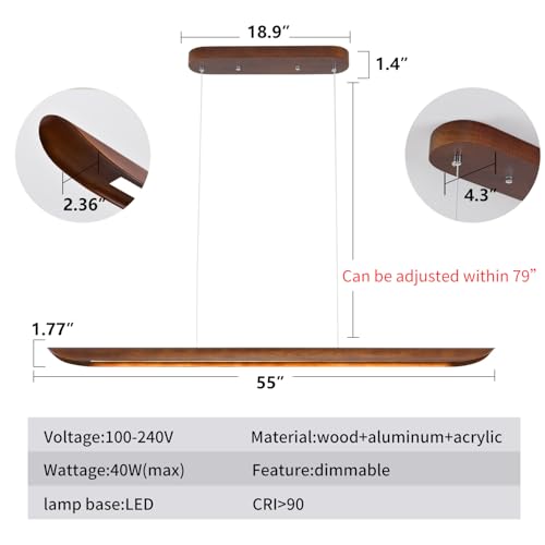 ?Smart Dimmable LED + Remote Control?This wood linear pendant Light size:55"(l)*2.36"(w)*1.7"(h)wattage: 40w.lumens:2600.The mounting part:18.9 x 4.3 x 1.4 inches(l*w*h) compatible with standard junction boxes.includes mounting hardware for vaulted,sloped ceilings.For indoor,covered patio use.NOTICE:please do not use dimming switch,dimming equipment has been configured inside the light,please use ordinary wall button switch.otherwise the light fixture may flicker.Adjustable hanging wire up to 79 inches long, easy to handle different heights, whether it is a kitchen island or dining room space, can be easily adapted to light up every corner.