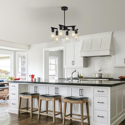 Unique Design Aesthetic:Modern farmhouse chandelier features a matte black metal frame and 6 clear glass shades, creating visual tension between the cool, hard metal and lightweight glass. Dining room chandelier features a 360° downward glare-free design that reduces dust accumulation by 70%. Black light fixture is ideal for kitchen islands, dining tables, living rooms or bedrooms