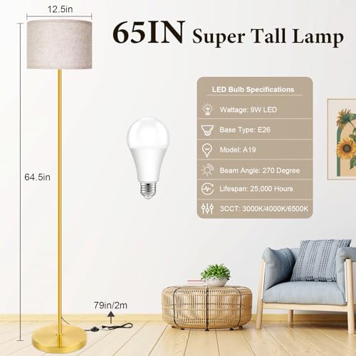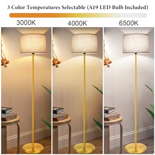 ?3CCT A19 Bulb Included?Each gold bedroom standing lamp includes a 9W 3000k/4000k/6500k A19 light bulb. You can choose your ideal lighting effect by a easy-operated foot switch. Compared to traditional incandescent bulbs, our included E26 LED bulb consumes 90%+ less electricity but provide higher lighting capacity. Besides, our 9w super bright LED bulb can be used up to 25,000 hours, so you don't need to replace bulbs frequently and help to save your labor cost