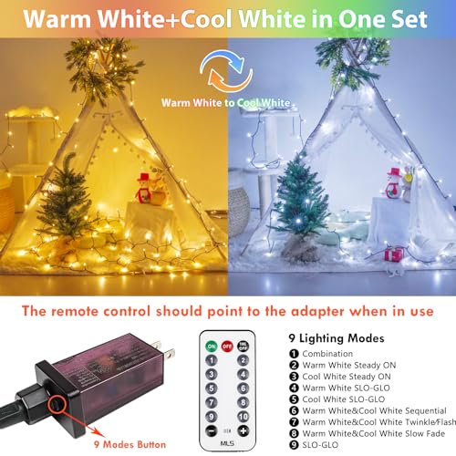 Unique Two Colors & 9 Lighting Modes: This light comes in two colors,Warm White and Cool White. 9 lighting modes are available, you can choose Warm White and Cool White by remote, which is equivalent to having two strings of lights. Different colors and flash modes will make your holiday decorations more colorful!