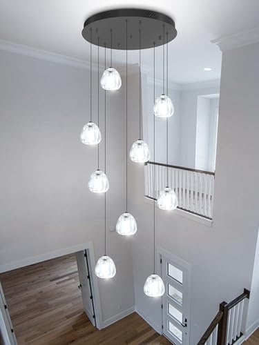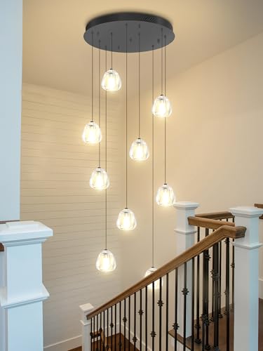 ?Staircase Chandelier Size?The raindrop chandelier ceiling plate has a diameter of 15 inches, with a maximum height of 100 inches. Each crystal measures 3 inches in width and 3 inches in height. The total weight of the chandelier is approximately 18 pounds.