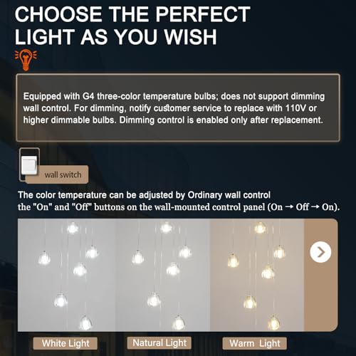 ?Hanging Chandelier Bulb ?: This product is equipped with 9 G4 type tricolor LED bulbs, supporting warm light, natural light and cold light. The color temperature can be switched by a "on-off-on" wall switch. Each bulb is 5W, and the entire chandelier is 45W; each bulb has a luminous flux of 500 lumens, and the entire chandelier has a luminous flux of 4500 lumens. It is suitable for a voltage range of 110V to 265V and is suitable for both household and commercial lighting.
