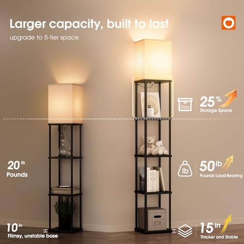 ?5-Tier Light & Storage Tower ?Upgraded with 5 tier floor lamp with shelves, this modern floor lamp offers even more storage and display space than traditional 4-tier designs. Built from solid wood for superior stability, each shelf supports over 50 pounds. At 70 inches in height, it fits perfectly in most homes, while the open-top frame ensures broad light distribution. Ideal for the living room, bedroom, office, or any space where you need both light and organized storage.