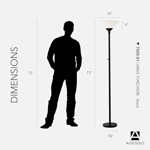 Accent Tall Lamp: The Aries floor lamp provides efficient ambient lighting for an entire room in a slim design. Simplicity shines in this look with a matte black finish and a tapered frosted plastic shade. An Adesso patented 300 Watt Double Socket construction allows for two crisscrossed sockets, each holding on/off 150 Watt incandescent or LED bulbs which provides approximately 3 times more light than a typical Torchiere.