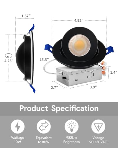 High Brightness: The led recessed lighting 4 inch slim downlights use the new generation of LED chips with higher lumens and lower power, 982LM consumes 10 Watts, saving you up to 88% in energy costs.