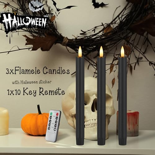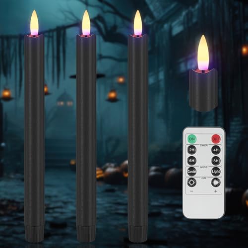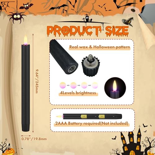????HALLOWEEN CREATIVE DESIGN: Mystery, darkness, hidden power black elements, with classic tall candles, add horror and creep atmosphere for Halloween home party decor. Made of real wax, with black 3D wick, these black flameless taper candles look and feel like a real candle. When you turn on the black candles, the warm white flame, perfectly simulating the real flame, emitting a nature candle’s light for a great Halloween atmosphere.