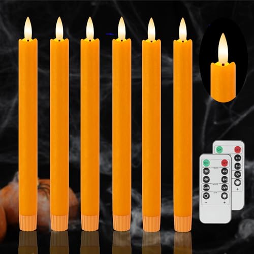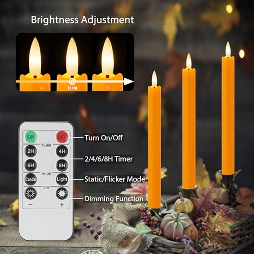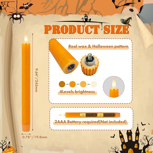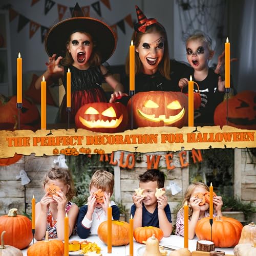 ????REALISTIC FLAME EFFECT: Made of real wax, with simulated 3D black wick flame, these flameless taper candles perfectly replicate the feel and look of real candles. When you turn on these orange candles, they emit the nature candle’s warm light for a timeless Halloween, Fall or Thanksgiving decoration.
