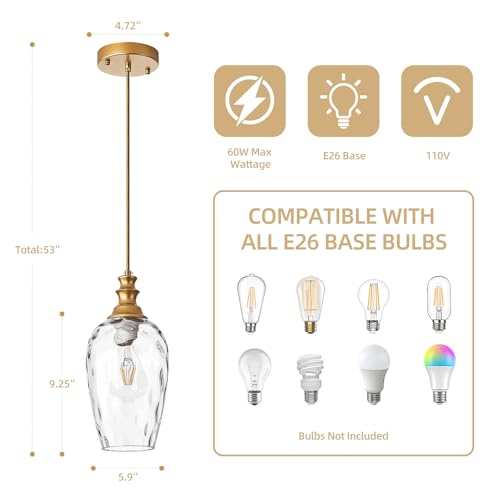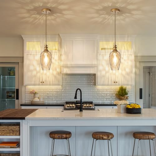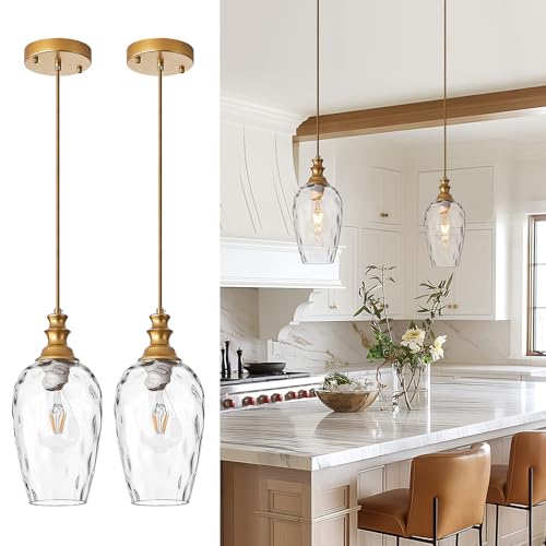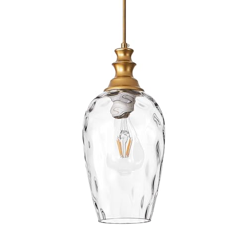 Glass Pendant Light Fixtures: AIBISOD gold pendant light for kitchen islands features a hand-hammered clear glass shade, blending retro charm with modern sleekness to warm kitchen nooks, sinks, islands, bars, and dining areas