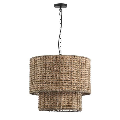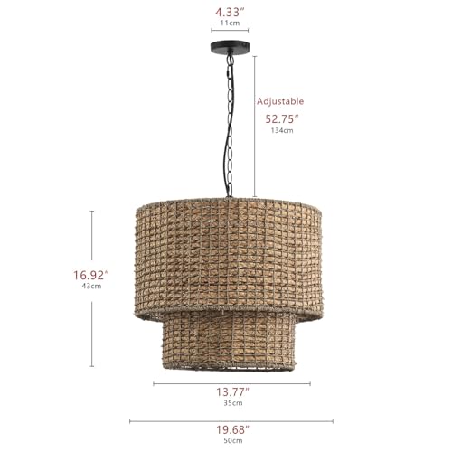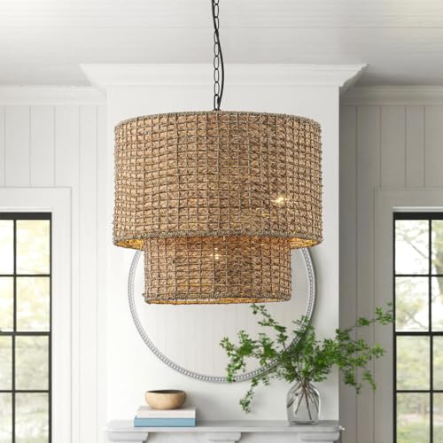?Coastal and Farmhouse Design?This rattan pendant chandelier light is made by hand woven of natural seagrass and rattan in an oversized 2-tier drum shape. It's a unique blend of eclectic nautical and rustic vintage styles, with a 4-light cluster in matte black casts generous light, that creates interesting shadow patterns on your space.