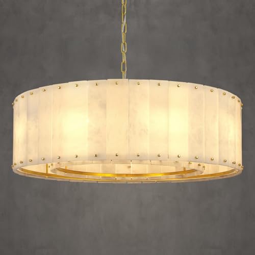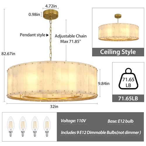?Unique Material and Craftsmanship?Alabaster Chandelier Crafted from premium Spanish Natural Alabaster, each piece undergoes meticulous grinding and polishing to preserve its original texture and distinctive veining. The Spanish Natural Alabaster design complements the one layer inside and outside sturdy gold-toned metal frame, housing 9*E12 bulbs that emit a warm glow.