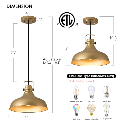 [Pendant lighting for kitchen island dimension]:Hanging lamp dome shade Dia.11.4-Inch,H:8-Inch; Ceiling Canopy: Dia.4.9-Inch; With a 73-Inch cord, Adjustable hanging max height: 84-Inch,min heiht 11-inch.
