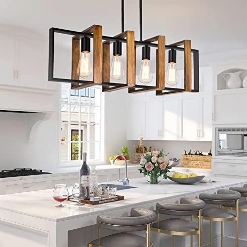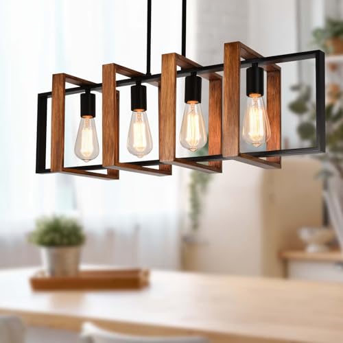 MATERIAL: Dining room light is made of 100% natural wood. Unlike other linear chandeliers, our kitchen light fixtures ceiling hanging is a rectangle formed by splicing two parts. Design principle is to reinforce the lamp frame so that not easy to bend or shake. Textured wooden frame with black metal finish, the electric wire wrapped in the lamp pole is not exposed, simple but elegant and safe.