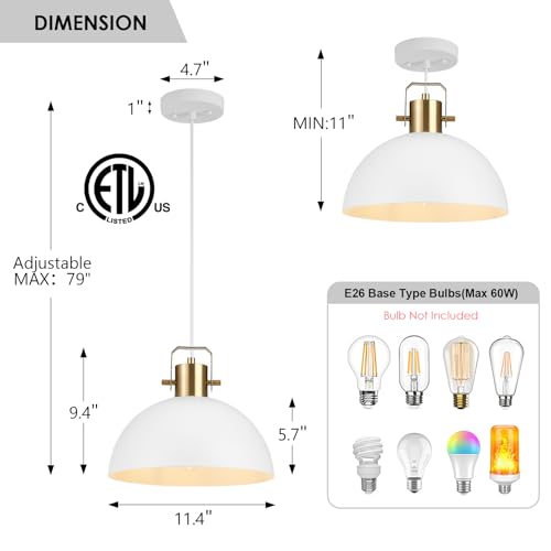 [Pendant Lighting for Kitchen Island Size]:Hanging light fixtures dome shade size:11.4-Inch,H:9.4-Inch; Ceiling Canopy: 4.7-Inch, Adjustable hanging max height: 79-Inch,min heiht 11-inch.You can adjust the wires to your favorite