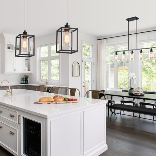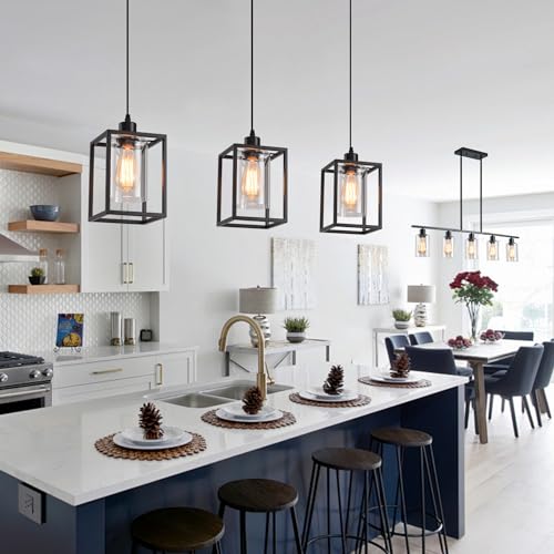 ?Unique Black Pendant Light for Kitchen Island ?This 1-Light geometric black pendant light features a metal frame with open sides lantern-style design gives this pendant light fixture a welcoming aesthetic. Featuring a unique clear glass shade and vintage style black metal base, the glass pendant light adopts excellent baking varnish process, outstanding oxidation resistance, hard to rust. Fine workmanship, durable in use.