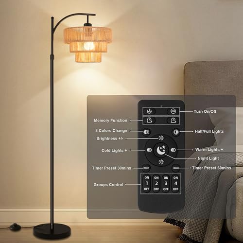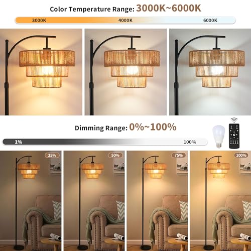 ?Color Adjustable & Stepless Dimmable?Our black arc floor lamp has stepless brightness adjustment (from 1%-100%), and stepless color temperature (3000K-6000K), which allows you to change the ambiance of the room with just a press of the remote. This rattan floor lamp for bedroom also have pre-set modes,you only need to select the appropriate color temperature and brightness suiting your needs like: reading, feeding, working and night light modes