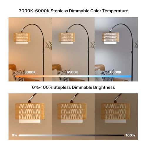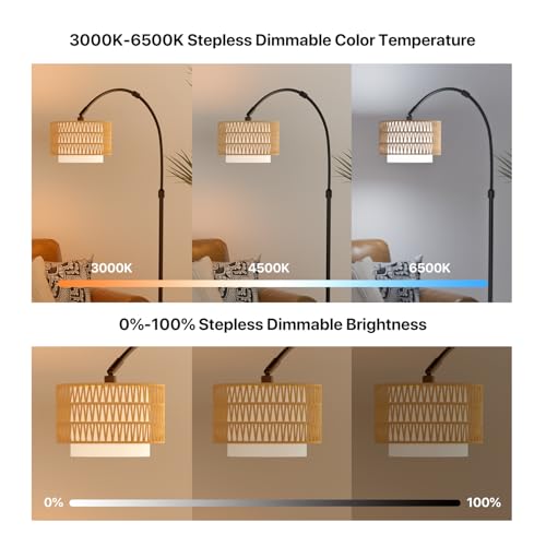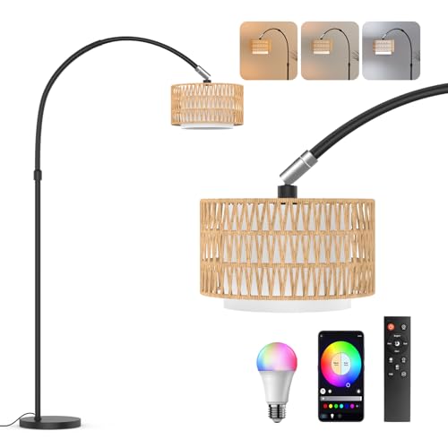 Dual Control via Remote Control or Foot Switch - With the purpose of saving your time to look for compatible bulbs, Lumenfox arched floor lamp comes with E26 LED RGB bulb. The bulb is paired with the remote controller, You can easily turn it on/off, adjust brightness, change colors or set timing modes by buttons, or connect this bedroom lamp to “Lamp Smart Pro” APP, and control this rattan floor lamp with your phone. (Max. remote distance: 65ft/20m, *2 AAA batteries included)