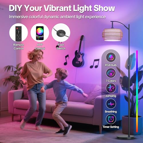 Floor Lamp with Remote & LED RGB Bulb - This boho rattan floor lamp for living room comes with a remote and a dimmable LED RGB bulb. There are three control methods for wicker floor lamp: APP Control, Remote Control and Convenient Foot Switch. You can easily realize the stepless dimming, timer function of this tall lamp via APP or remote. The convenient footswitch can be turned on or off to free up your hands.