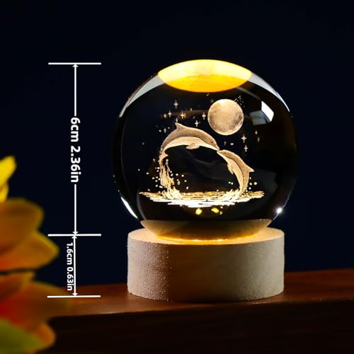 ?Perfect Gift & Decoration?: Dolphin Crystal Ball include one 2.36 inch Dolphin K9 Crystal Ball; 1 wooden base with USB Cable; 1 greeting card; Exquisite gift box packaging.The crystal ball is an exquisite desktop decoration, a cool gift for your friends, boyfriend, girlfriend, family, etc. And the unique design will decorate the bedroom, living room, dining room, and outdoors with warmth and create an ideal living environment for your family.