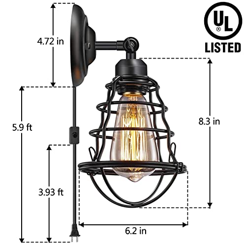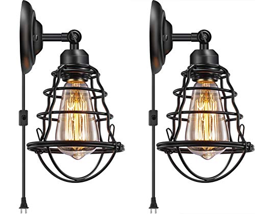 Industrial Plug in Wall Sconce Set of 2 -- Each specially comes with 5.9ft plug in cord with on/off switch, which is very convenient. The wall lamp plug in design features a 180°adjustable head, you can make the light cast upward or downward for mood or ambient lighting, add a touch to your home.