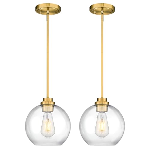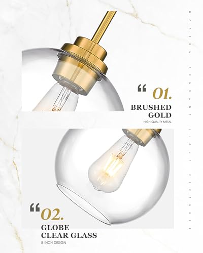 Trending Design: The pendant light fixture combines an 8-inch clear glass globe shade with brushed gold metal finishes, balancing simplicity and elegance. Its domed contour directs soft downward light, creating a bright, refreshing ambiance - ideal for kitchen islands