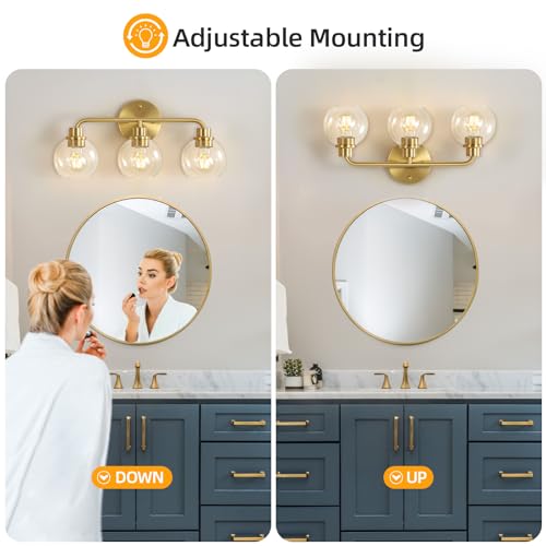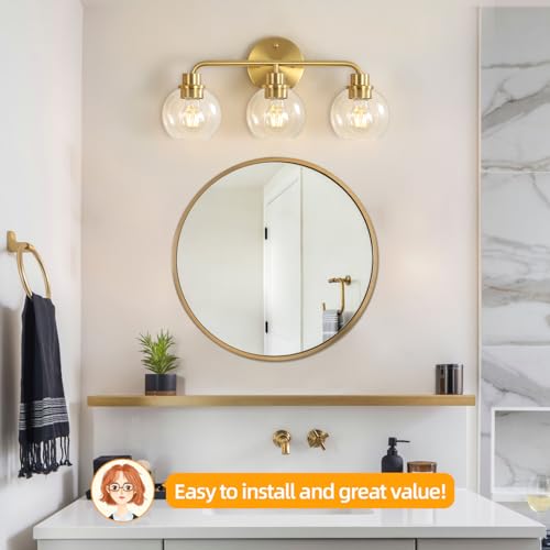 ?????Stunning Pure Gold Color & Modern Design: Our 3-light gold vanity lights have a very pure gold color that will never let you down! Crafted from metal and globe glass shades, this gold wall mount light finished in a gold stylish appearance! Total brushed brass vanity light size 19.69 inch L x 6.96 inch W x 9.11 inch H.