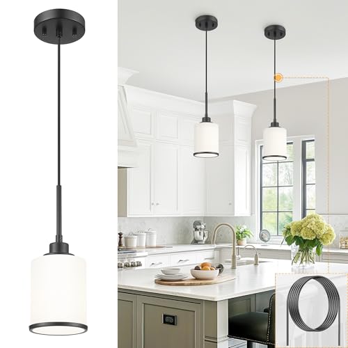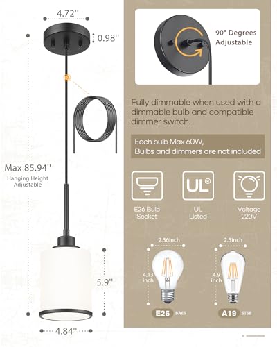 Adjustable Size and Height: The kitchen island pendant lights offers max height: 85.94”, lamp shade width: 4.84”. The modern pendant light includes adjustable soft cord design (Not Rods), enabling you to chose the fixture length to match your style and room layout. The ceiling canopy measures 4.72” in diameter, suitable for low, high, flat, or sloped ceilings.