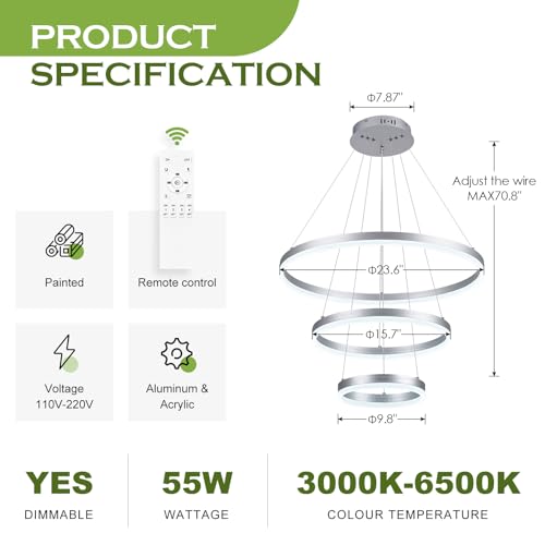 ????Modern Chandelier: This modern led chandelier silver is based on an energy-saving concept and is made of high-quality aluminum, metal, and acrylic materials. The circular ring of the led chandelier cleverly combines with the elegant design, making it perfect for your home. 3 ring diameter: 9.8"+15.7"+23.6".