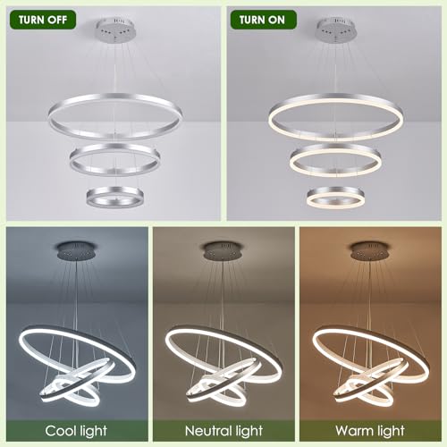 ????Stepless Dimmable Chandelier: The 3 rings chandelier is equipped with a remote control, which has a 10% to 100% dimming function and can adjust the brightness according to your needs. You can also adjust three different color temperatures, 3000K warm white light, 4500K neutral white light, or 6500K cold white light. Different color temperatures can meet your different needs. It has a uniform lighting effect, no flicker, no glare, and is more energy-efficient.