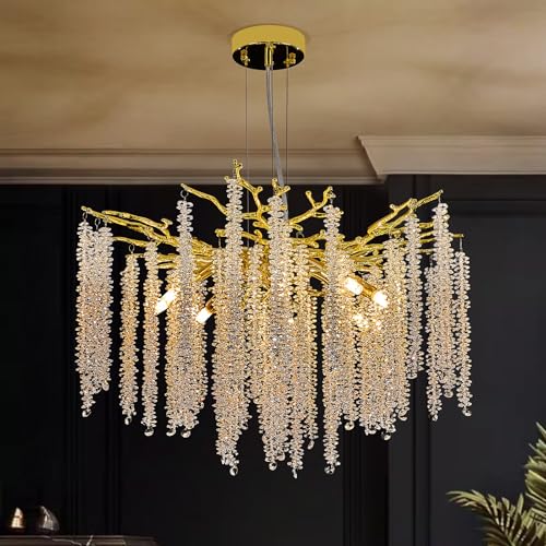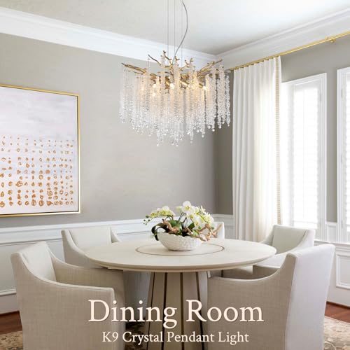 Height Adjustable Crystal Raindrop Chandelier: This Contemporary Branch Chandelier Dia is 23.6" with an adjustable cord. This Gold Chandelier for Dining Room support can be adjusted flexibly from 11.8" to 74.9" height. The Modern Crystal Pendant Light could work on all ceilings, including flat, slanted, vaulted, or sloped ceilings