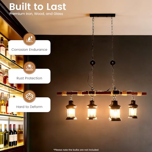 ?8 Light Farmhouse Pendant Light?The 8 Light Farmhouse Pendant Light is made of very hard wood that won't deform or fade easily. The lampshade is made of high-transmittance glass, which can provide you with bright enough light. The lampshade is made of high-quality lacquered metal, which has high strength, corrosion resistance and is not easy to rust.