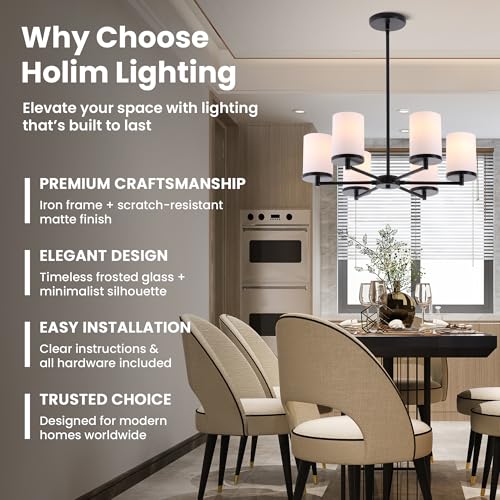 Modern Black Chandelier with Frosted Glass Shades: This 6-light black chandelier features durable metal construction with frosted glass shades that soften and diffuse light. The modern chandelier design blends seamlessly with farmhouse, transitional, and contemporary styles, making it ideal for use as a dining room chandelier, kitchen chandelier, or living room chandelier.