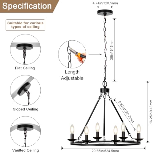 Dimension: Wheel Diameter: 20.65in, Fixture Height: 16.25in, Max Chain Length: 36in. Black chandelier works for sloped and vaulted ceiling, perfect to hang on your kitchen island, porch, stairway, dining table, living room, entryway, bedroom, foyer, etc. Please check the size information on the second photo carefully before purchasing.