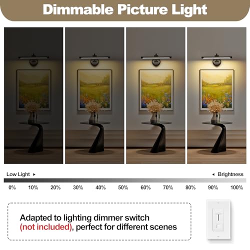 Dimmable Picture Lights: The gallery art light for paintings is dimmable with 10%-100% dimming range. The lights for pictures on wall are compatible with most standard LED dimmers (not included), offering you flexible picture lighting control to meet your needs. This feature ensures energy efficiency and enhances the overall aesthetic appeal of your space, making it a must-have for modern homes