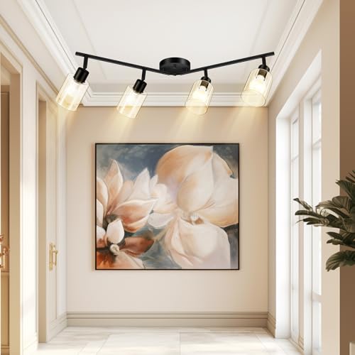 Unique Flexible Rotatable Track Heads; The glass 4-light kitchen track lighting ceiling create with double two-light center swivel bar construction, which extend the further lighting goes whatever direction you need. With the adjustale crossbars and articulate light head, you can focus the light in different directions to get perfect multi-directional lighting even large room or small.