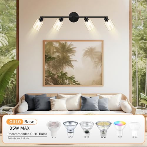Modern Glass Track Lighting Kit; BoostArea 4 light track fixture is made of sturdy and heavy-duty metal in matte black finish, which is anti-rust and corrosion, super easy to clean, simple but sleek. Ideal classy lighting for indoors as a ceiling Light, bathroom sconce light, vanity light, bedroom bedside light, living room lights, exhibition light, and hallway light, picture wall light?bar light, coffee shop light.