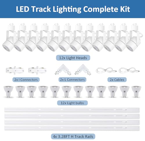 ?GU10 3CCT Track Light Kit ?H type track light kit includes 12* GU10 light heads,13.12ft aluminum tracks, 4* I connectors and 1* electric cable, making it easy for you to quickly complete a track light system.This track lighting fixtures system can make natural, textured and precise lighting effects.